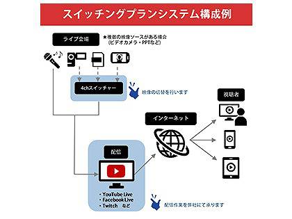 | セット内容 | 4chマルチスイッチャー スイッチャー用小型モニター マルチコンバーター 配信用ノートパソコン ケーブル一式 オペレーター2名 |