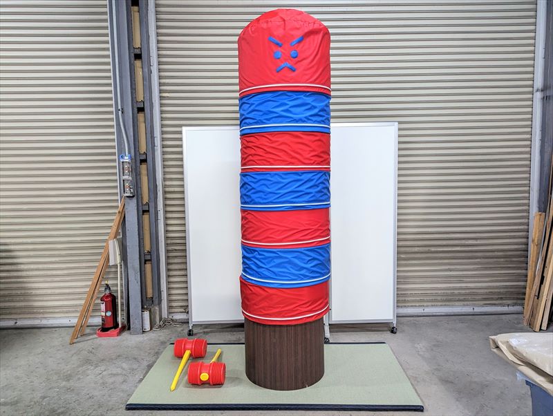 今回ブログでは”ダルマ落とし”を紹介したいと思います! 普段目にするダルマ落としはテーブルの上にちょこんと乗った木製の物を小さなハンマーで叩くという印象があると思います。 当社で扱っているのは巨大ダルマ落としという商品で、巨大と名前が付くだけにとてもビッグで存在感がすごいんですよ!
