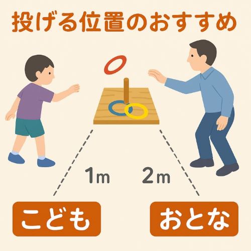 「輪っか」を3ヶ渡して、輪投げ台に立っている的に入れた数により景品を渡します。入らなくても残念賞のプレゼントをあげましょう。