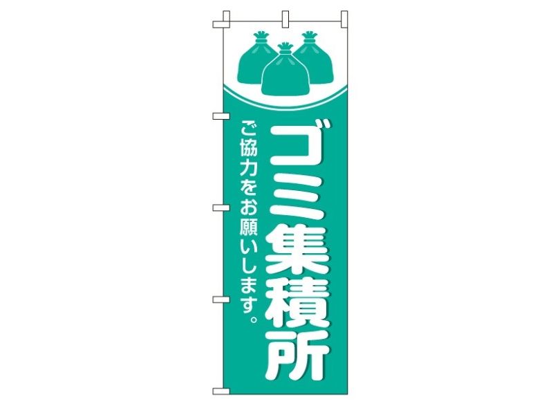 ゴミ置き場・ゴミ回収場所を「ここです」と分かりやすく案内できる、既製デザインののぼり旗です。ミントグリーンを基調に、「ご協力をお願いします。」の白文字と緑のゴミ袋イラストで、やわらかい印象のまま利用者へマナー協力を促せます。設置することで、美化意識を高めたり、決められた場所への排出を促す効果も期待できます。