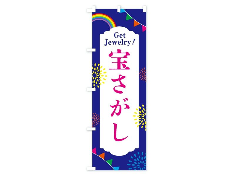 宝さがし企画の告知にぴったりな、イベント向けのぼり旗です。視認性の高いフルカラーダイレクト印刷で、受付まわり・導線・実施エリアの目印づくりに活躍します。 発色のいい鮮やかなデザインで、人目でなんの出展ブースかわかりやすいところが特徴です。