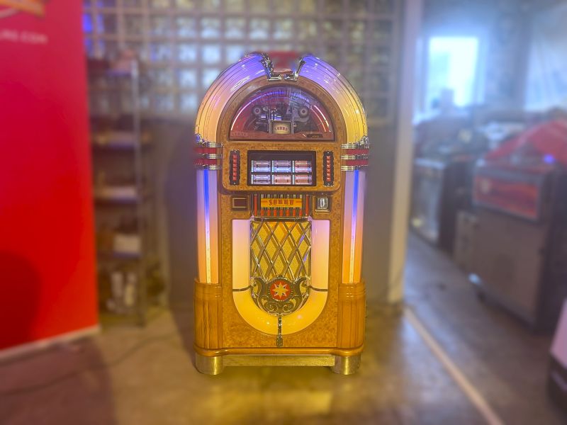 こちらの商品は、イギリス発の本格派ジュークボックスです。1940~50年代のデザインを忠実に再現しつつも、現代の使用用途に合わせた機能が豊富に備わっています。 アンプによるサウンド出力だけでなくBluetoothにも対応しており、現代のデジタル媒体の音楽も流すことが可能です。中のタイトルカードに自由にカスタマイズすることで、 ご使用用途に合わせて雰囲気を楽しめます。レコードが回る様子がよく見える仕組みですが便利な機能が搭載された現代のジュークボックスです。