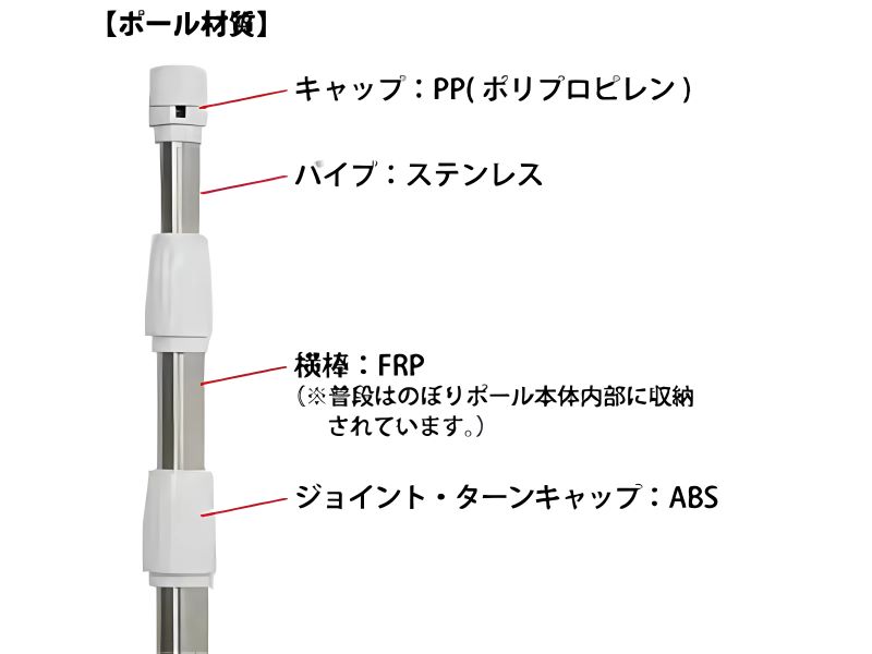 | 材質 | パイプ:ステンレス、ジョイント ターンキャップ:ABS 横棒:FRP キャップ:PP(ポリプロピレン) |