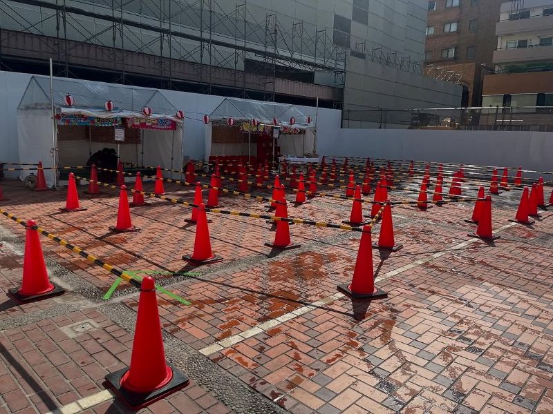 イベント前の設営のスペース確保にカラーコーンを使用しました。 人通りの多い場所で設営作業をする場合は、このようにカラーコーンなどで歩行者の方に危険がないように作業スペースを確保しなければいけません。 このようにイベント本番でなくても、カラーコーンはイベントでの必需品ですね!このカラーコーンは、本番時にはそのままお客様の動線確保にも使用しました。