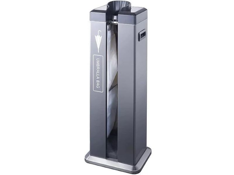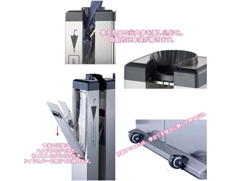 傘を入れて手前に引くだけで傘袋がカンタンに取り付けられる傘袋スタンドです。 上から傘を入れて手前に引くだけ! 自動でスピーディーに装着できるので、お客様の流れを止めません。 大雨や梅雨時期にもおすすめ! 片手で使えるので、濡れた傘を傘袋に収納する時に持ち物や衣服が濡れません。 傘立てでの忘れ物、盗難などの解消にも役立ちます。 電源不要ですので、オフィス、テナントビル、ショッピングセンター、学校、病院、百貨店、スーパー、デパート、劇場、ホール、飲食店などどこにでも気軽に設置できます。