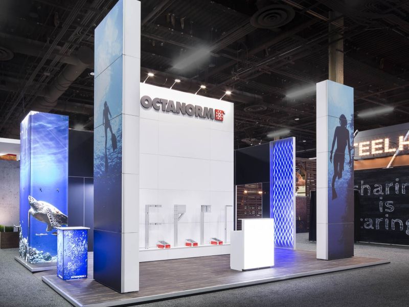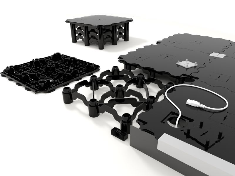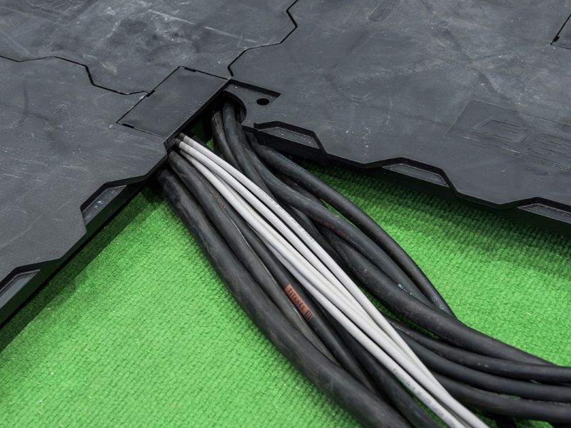 こちらのオクタエコフロアは環境に配慮した商品です。黒くてシンプルなデザインのため、床上げとして主張することがなく様々な場面に馴染みます。 頑丈で耐荷重もしっかりしているため、重い展示物やステージ什器の設置も可能です。さらにケーブルを通す穴が各シートに空いているため、照明や音響機材のコードも隠しながら収納できます。 数種類の部材があるため、組み合わせることでスロープや高さ調整など様々な用途に合わせて対応できます。オプションでLED装飾も可能です。