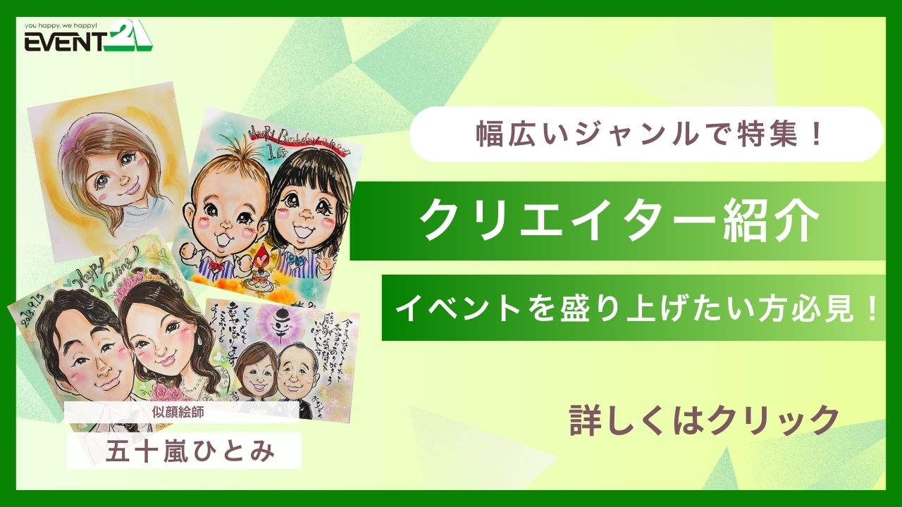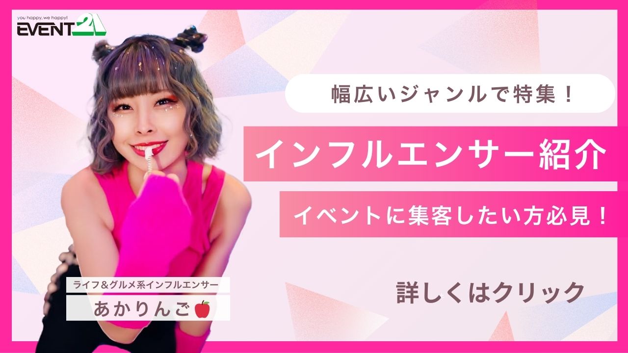 イベント21は、WEB上でパフォーマー(演者)、インフルエンサーの皆様をご紹介しております!会場にいらっしゃった沢山のお客様を「わっ!」と言わせるあなたのパフォーマンスやSNS活動を、インターネット上で情報発信してみませんか?イベントを盛り上げる為のチャンス作りに、私たちも貢献出来たら幸いです!掲載ご希望の方は、一度お問い合わせ下さい!