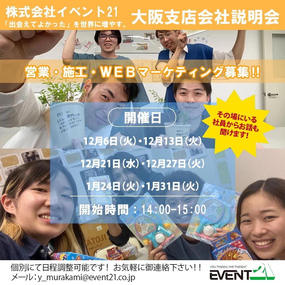 僕は結構ギリギリまで就職活動をしていて、自分が働きたいと思える会社を探しながら説明会に参加したり、面接に行ったりしている中で、その中でもイベント21の説明会って変わっていたなぁと思っていて、今自分が働いて居るからこそわかるんですが、自社のことを社員が説明をしていくのは、どんな企業でも同じかなと思うんですが、イベント21はかなり学生一人ひとりに寄り添いながら説明会をしていたなぁと思いました!