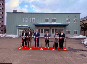 北海道支店をバックにテープカットを行いました!普段はお客様のイベントに立ち合い備品を準備している側なので