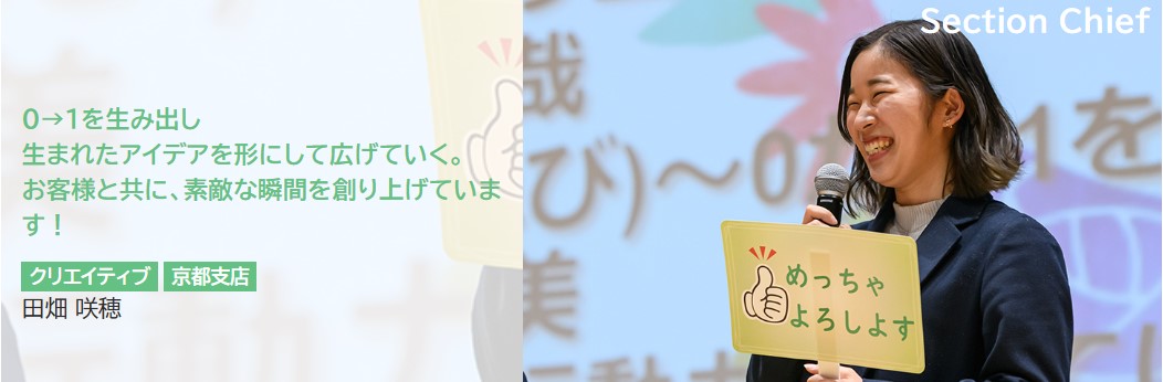 イベント21のクリエイティブ事業部のセクションチーフをさせて頂いてます田畑です!クリエイティブ事業部では、企画や運営など、レンタル系だけでなく、幅広くご対応させて頂いてます。イベント21は、イベント関係のレンタルや設営撤去をする会社ではありますが、それだけでなく、世界へhappy!をクリエイトする会社になります!お客様へ寄り添ったサービス力で、三方良しを目指して、日々対応させて頂いております。