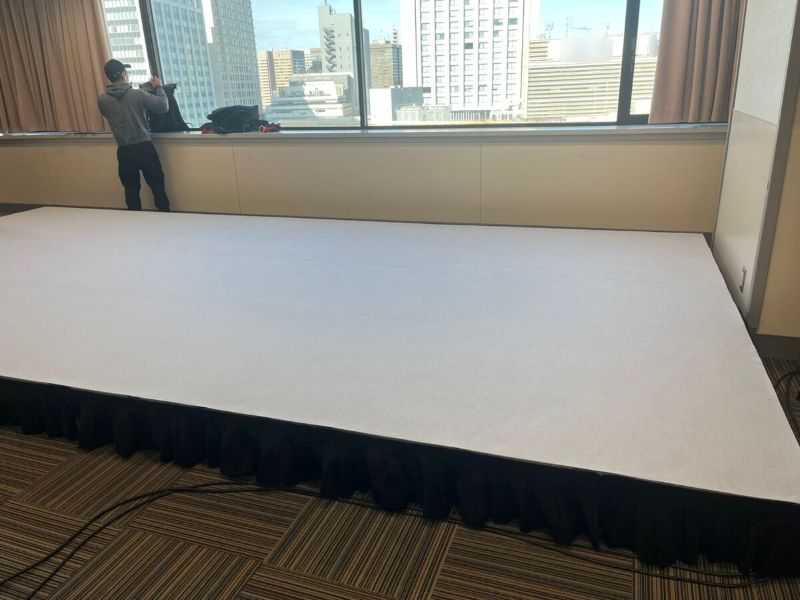 先日国連大学本部ビルで10周年イベントのステージを設営を行いました! 簡単ステージ(1000mm×2000mm)と正方形お立ち台(1000mm×1000mm)を組み合わせて(D)3000mm×(W)8000mmのステージを組み立てました! 施工数人で設置させていただき、無事にイベントを終えることができました! ご依頼いただいたお客様から感謝の言葉をいただいたり、今回のような素敵なイベントに携われて、とてもうれしかったです!これからも頑張ります!