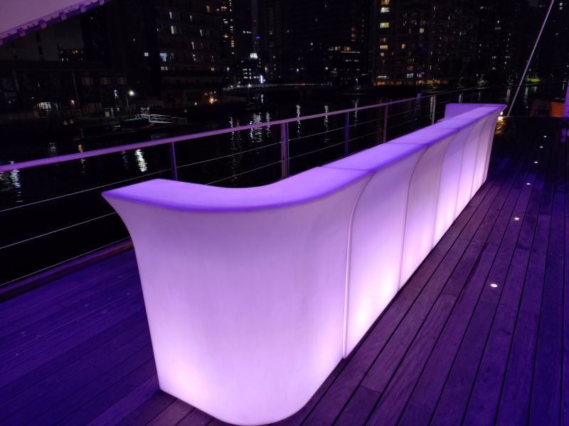 パーティーにて、夜の野外イベントを彩る、 LED内蔵の光るバーカウンターを利用いただきました。 リモコン操作でカラー切り替えが可能で、ムードを自在に操れるので かなり自由度の高い商品です。 コード不要の充電式設計のため急なレイアウト変更や移動もスムーズに行えます。 ドリンクコーナーはもちろん、受付や装飾スペースとしても存在感抜群です。