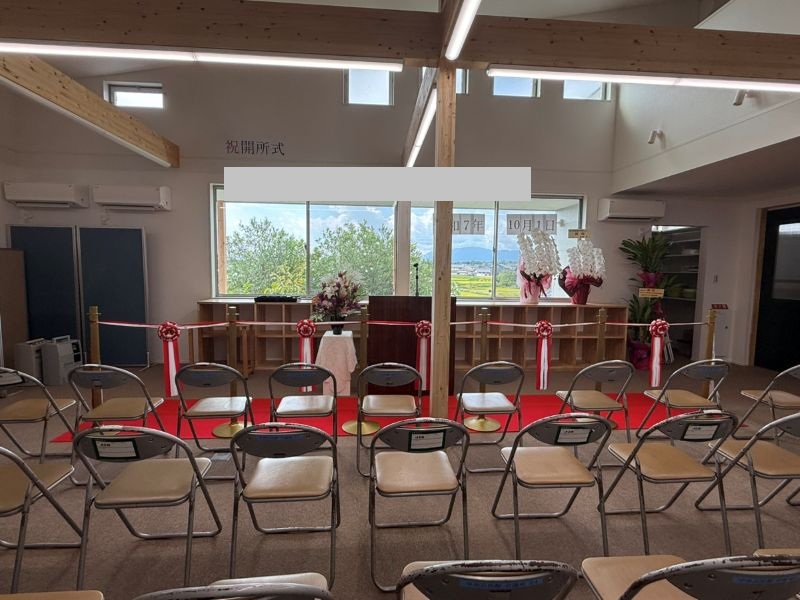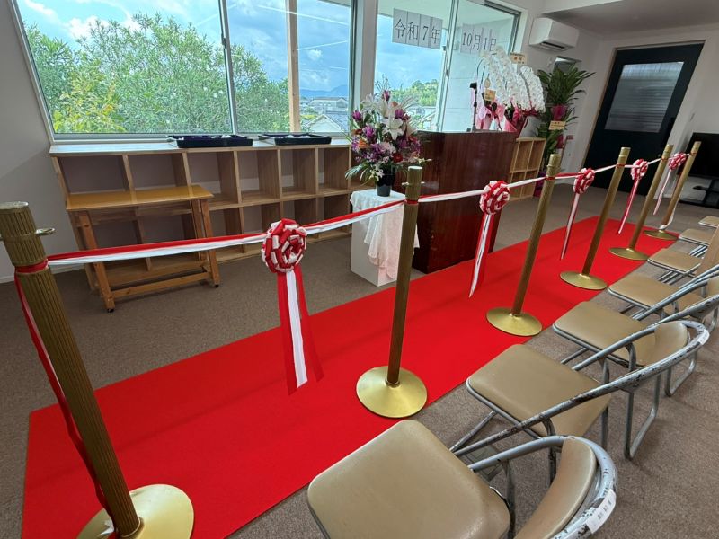 奈良県の香芝市で集会所の開所式に使用しました。金ポールはテープカットの際に使用する物品のひとつで、人数によってポールや金バサミの本数が変わったりします。またスペースによっても本数を変えたりします。床にはレッドカーペットを敷いて、本格的な雰囲気に仕上げております。こういったセレモニーの式場で使う物品は、何を揃えれば良いのか?どんな作法で、どんな順番で使えばいいのか?お悩みの際は是非ご相談ください。