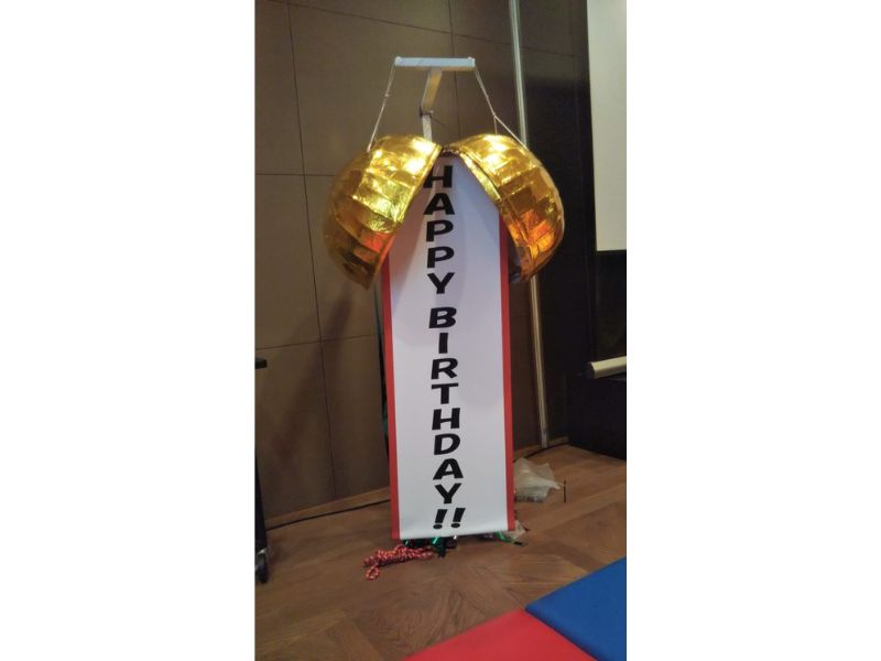 くす玉はオープニングセレモニーや竣工式以外にもこのような使い方もできます!くす玉といえば、なにか大きなイベントに使うものだと思われがちですが、社内行事でも使うことができます!こちらの画像はイベント21大阪支店で拠点内単月MVPを表彰する際に使用した写真です!このときは直径450mmの商品を使用し、中に紙吹雪の代わりに 受賞者が好きなお菓子を沢山仕込んでいました。このように、社内行事やその他のお祝い事でもお気軽にお使いいただける商品となっていますので、ぜひご活用ください!