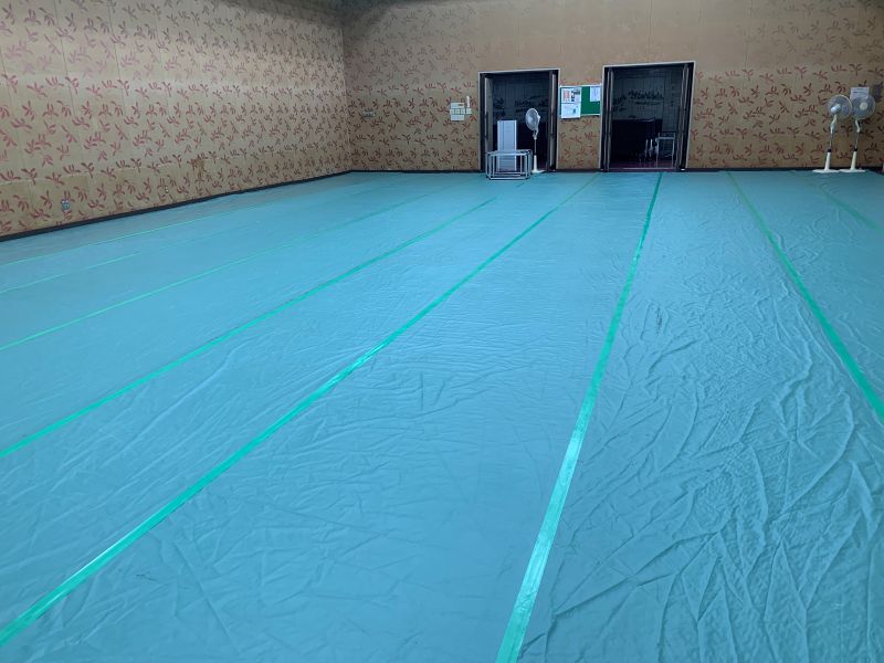 卒業式で懇親会パーティするための床養生としてフロアシートを敷きました!フロアシートを敷くと靴で入れるので普段は土足禁止な場所でも立ち入り出来るようになります。