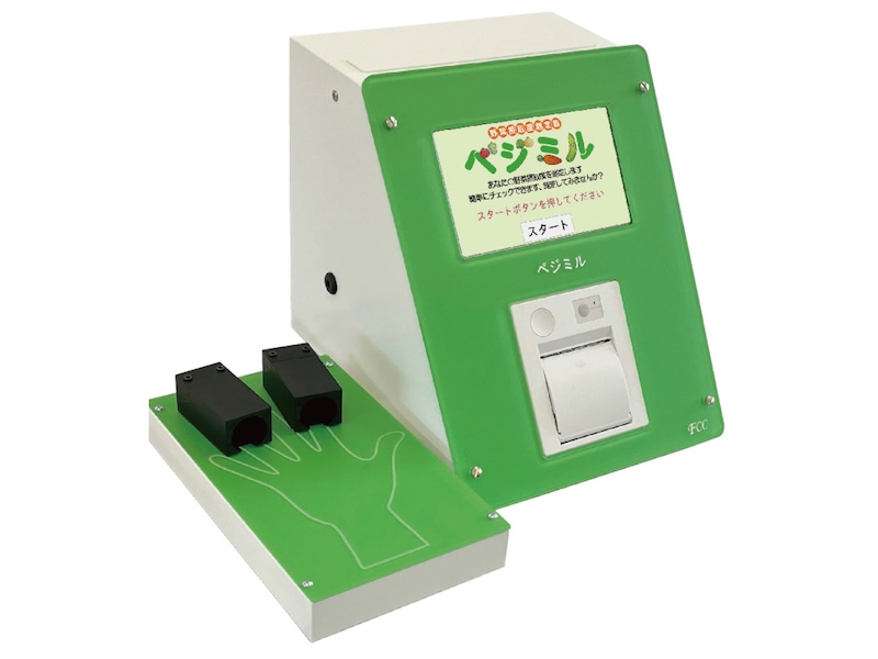 ベジミルは、人差し指と薬指に光を照射して皮膚の反射率を測定し、独自のアルゴリズムで野菜摂取度(皮膚カロテノイド)をわずか30秒で判定できる健康チェック機器です。測定結果は「ベジミル値」「ベジ健康度」「総合評価」「コメント」「ワンポイントアドバイス」として表示され、タッチパネルで誰でも簡単に操作可能。さらに、データ保存や比較もでき、USBでの出力にも対応しています。健康イベントや展示会、栄養指導、企業の健康管理プログラムに導入すれば、参加者の興味を引きつけ、健康意識の向上にもつながります。短時間で行えるため、来場者の回転率が高く、イベント運営にも非常に効果的な機材です。