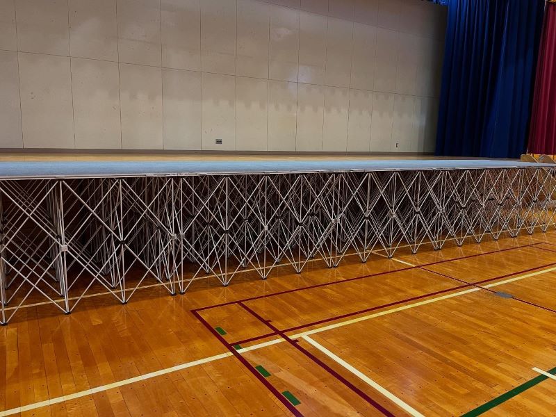 ジャバラ式の脚(ライザー)を広げて天板を乗せ、固定するだけで完成!手間いらずの正方形お立ち台です!弊社商品の「簡単ステージ」の1m×1mサイズです。スピーチ台などの用途にも適しているのですが、沢山のステージを並べているところにコーナー用として1台設置するのも良いでしょう。教室やフロアだけでなく、音楽ホールなどの外観ともよく馴染みます!