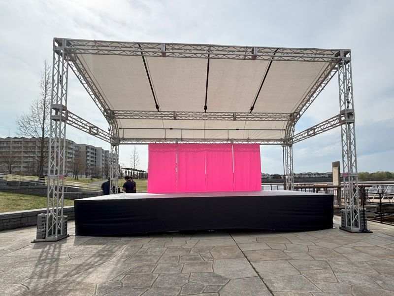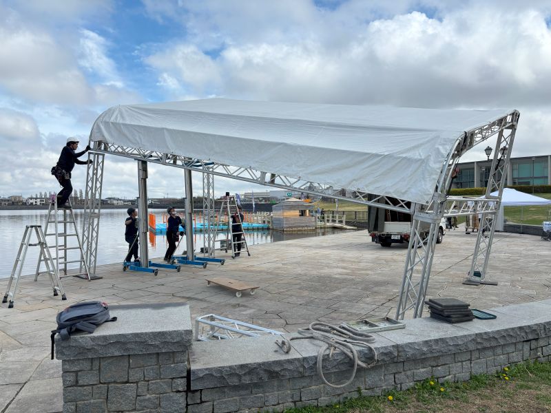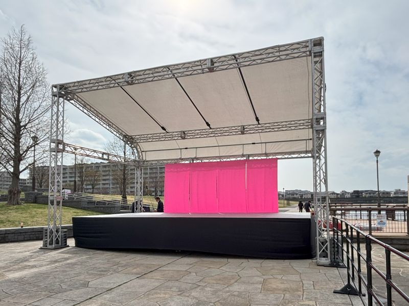 先日越谷レイクタウンにて8坪のステージとステージテントを立ててきました! 湖のわきなので限られたスペースではありましたが、迫力なる立派なステージになりました!その他のイベントに必要な備品類も納品させていただきました。イベント当日は雨の予報だったので、ステージ表面は樹脂無しの雨でも滑りにくい素材で設営しました!事前に天気などの影響も考慮して臨機応変に対応しておりますのでご安心ください!