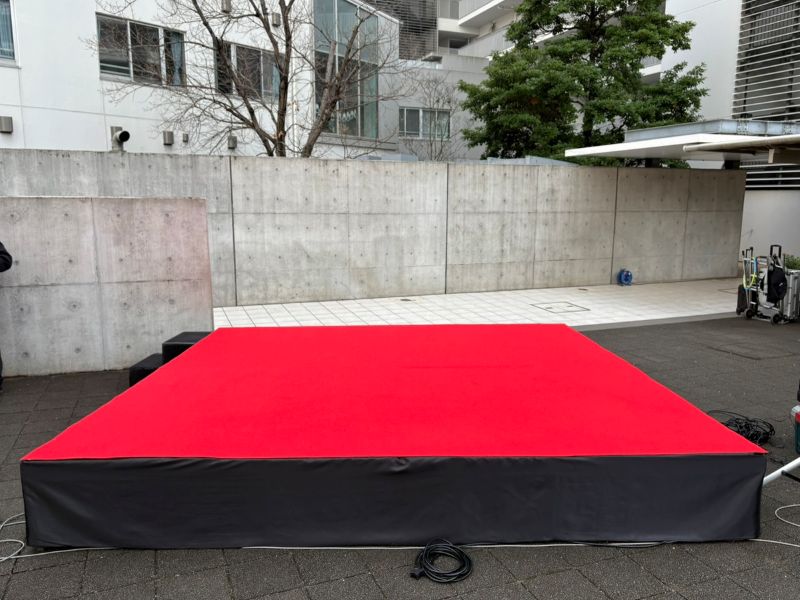 花会式の会場で、来場者の方が歩けるスペースの延長用スペースとして床几台をご利用いただきました。 今回はただ床几台を設置するだでなく、赤のパンチカーペットやステージスカートなどを付けて華やかさのあるものに。 イベント本番は雨が降ってしまいましたが沢山の来場者の方にお越しいただき、イベント担当者の方からもいつも通りありがとうというお言葉をいただきました。