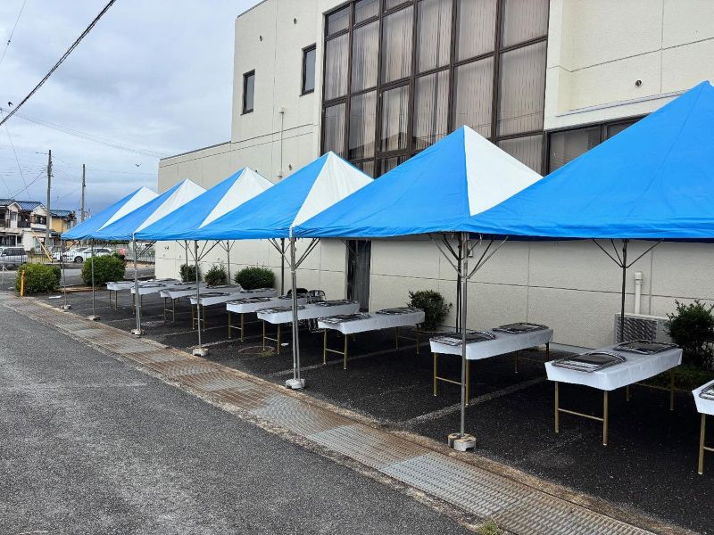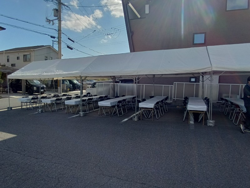 急遽キッチンカーを横並びにして壁をつくり、雨や風をしのぎながら、パックでの食事提供に切り替えました。こういった予想外のトラブルも、現場の皆さんと一緒に臨機応変に対応できたのが印象的でいい経験になりました!