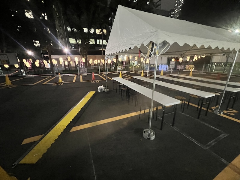 以前は別業者様にご依頼をいただいいたのですが、縁があり、イベント21にご依頼いただきました。 プラスチックテーブルと軽量丸椅子の組み合わせはもう定番でものすごくよく出る組み合わせです。色も白と黒という落ち着いた色味に食事とお酒がたまらないですね。 あいにくの雨でしたが、沢山のお客様が、お酒と料理を囲んでコミュニケーションを取っている姿に嬉しく思いました!