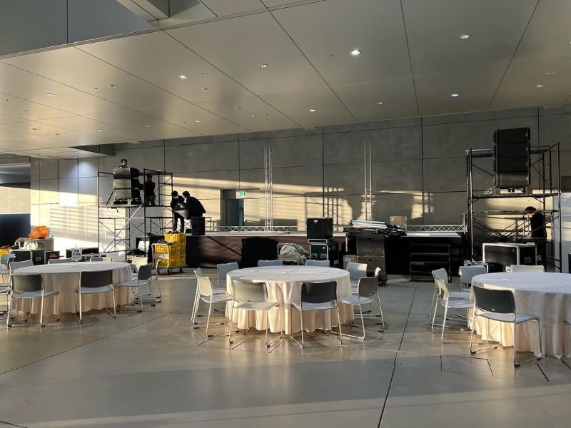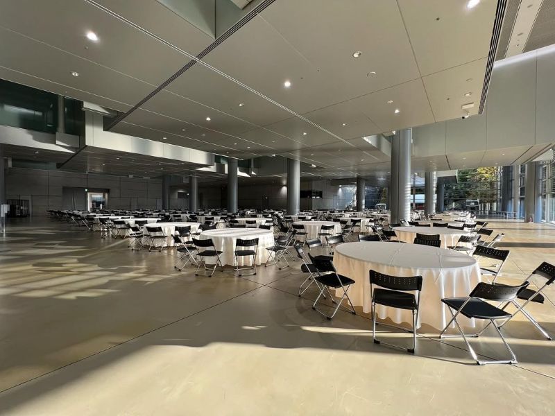 今回は懇親会会場創りのため、大きめの直径1,800の丸テーブルと清潔感溢れるテーブルクロスを設置させていただきました。 着席で10名ほど座れることができ、くつろげるぐらいのスペースも確保しました。来客されたお客様にも大変喜んでもらいました!このような懇親会の会場創りは弊社の得意分野の一つです。一緒に心に残るイベントを創りましょう!