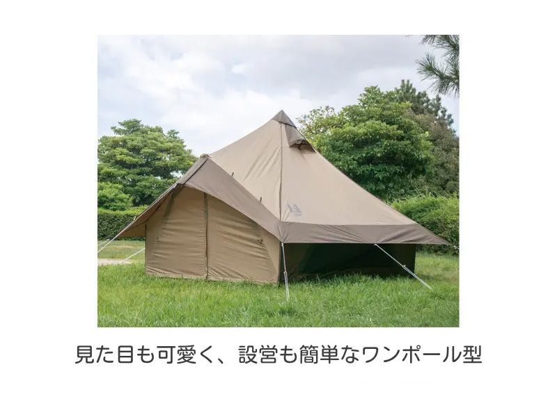 こちらのテントは、軽量なワンポールテントで、キャンプ初心者でも楽々と設営できるように設計されています! 大人3人ですが、お子様も含めると4人ご利用いただけます! 通気性が高く、天井が高いので広々とした空間で過ごすことができます! 4m以上の広さを確保できれば女性だけで簡単に設営できるので、是非広場などでご検討くださいませ!