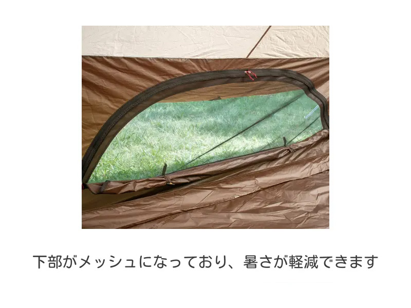 | 材質 | 本体本体:75Dポリエステルタフタ・PUコーティング耐水圧1,800mmミニマム・UVカット加工・テフロン撥水加工 ルーフシート:75Dポリエステルタフタ・PUコーティング耐水圧1,800mmミニマム・UVカット加工・撥水加工 マッドスカート:210Dポリエステルオックス・PUコーティング インナーウォール:68Dポリエステルタフタ ボトム:210Dポリエステルオックス・PUコーティング耐水圧1,800mmミニマム フレーム:A6061(φ16mm+φ14.5mm) |