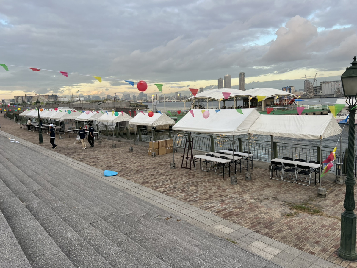 横浜の本牧にあるキャンプやドッグランがある公園です。今回はその中のひざくらの丘で行われたハワイヤンフェスタに3坪テントを納品させて頂きました。 屋台や出し物で出店する際に丁度いいサイズなのが3坪テントで、今回は写真には収まらないほどの3坪テントを設営させていただきました。 3坪テント以外にも6坪や8坪と用途に合わせてご提案させていただきますので、気軽にご相談ください!