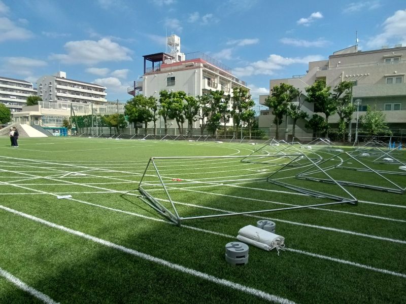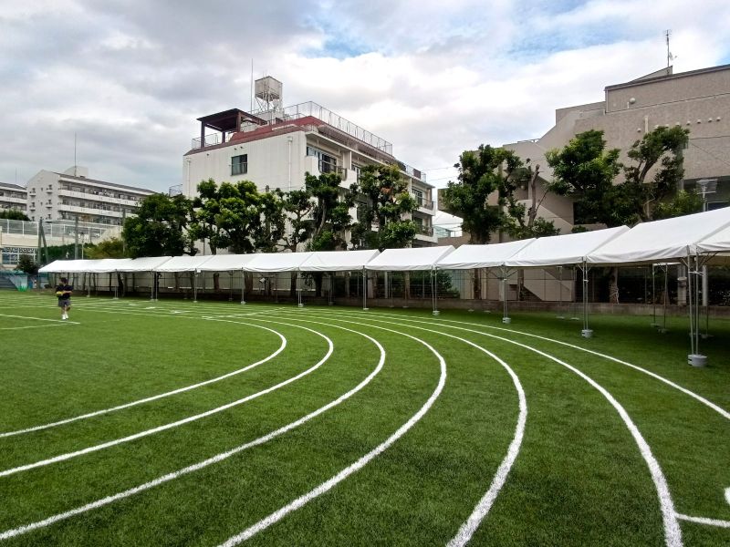 先日、小学校のグラウンドに57張設営してきました!テントの他にテーブルなどの備品もレンタルいただいたため、レンタル量が多い中で予算感も視野に入れながら細かいヒアリングをしながら設営まで進めていきました。 お客様から事前にテントを立てるレイアウトを頂いていたため、微調整は必要だったもののスムーズに設営できました!レイアウトの図があると設営しやすいですが、弊社スタッフが事前に現場に行って実際に確認してレイアウトを 考えることも可能ですので、ご不明な点や不安な点はお気軽にご相談ください。57張のテントやテーブル、ウェイトを30名弱で7時間ほどかけて設営いたしました。今回のように車両がグラウンドの中に入れない場合でも臨機応変に対応して 設営させていただきますのでご安心ください!