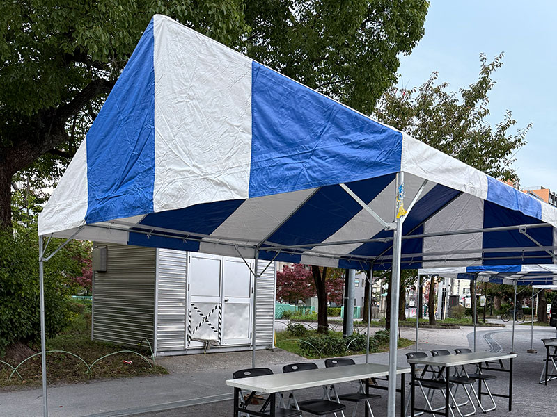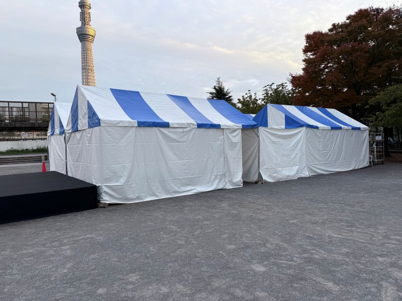 先日の音楽イベントでは、青白の天幕テントを設置し、来場者の皆さまが安心して過ごせる空間をつくりました!横幕も取り付けたことで、周囲の視線を気にせずゆったりと休めるプライベートなスペースに。日差しをしっかり遮りながらも、爽やかな青と白のカラーで会場全体が明るく、清潔感のある雰囲気になりました。暑い日でも快適に過ごせる環境づくりを心がけ、多くのお客様に喜んでいただけた現場でした!