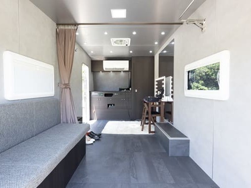 屋外での撮影やイベントにおいて着替えやヘアーメイク、休憩室やスタッフルームの確保など、様々な用途で活躍する移動式トレーラーです。