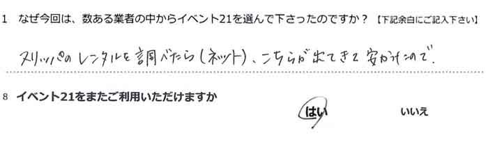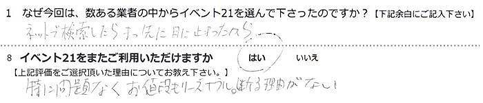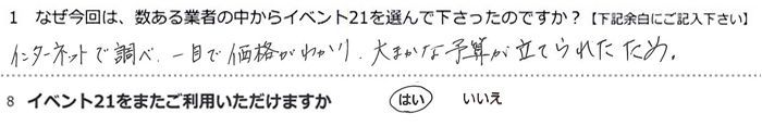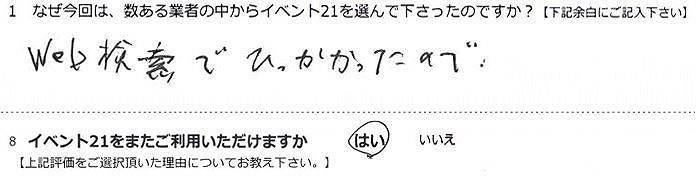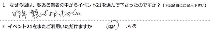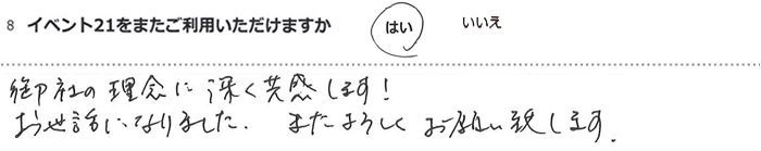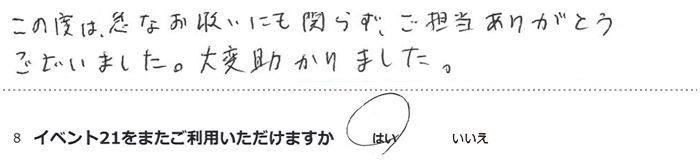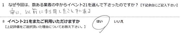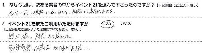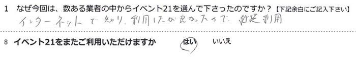 この度は弊社をご利用いただき誠にありがとうございます。 お客様のイベントが大成功するよう精一杯努力しますのでまたなにかありましたらよろしくお願い致します。
