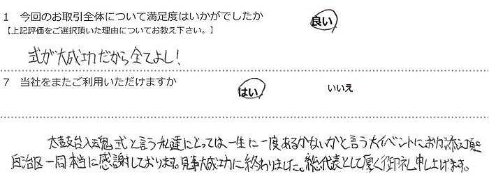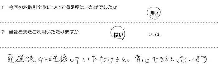 この度は弊社をご利用くださり、ありがとうございます。これからもお客様にご満足いただけますよう精進してまいりたいと思いますので、また機会がございましたらよろしくお願い致します。