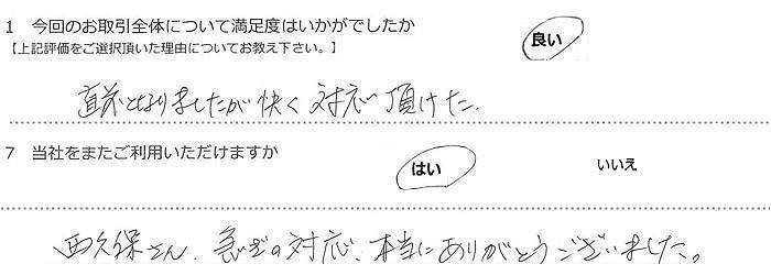 この度は急なお願いにも関わらず、ご担当ありがとうございました。大変助かりました。