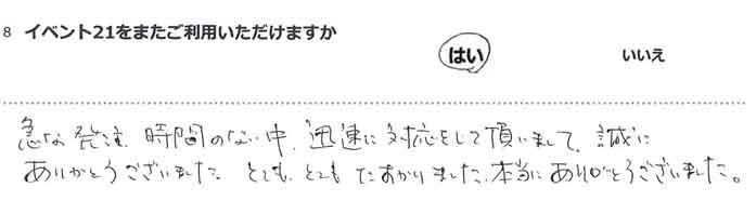 この度は弊社をご利用いただき、ありがとうございます。 また、今回はホームページをご覧いただき、お問い合わせくださったとの事で、数あるホームページから弊社のホームページを見つけてくださり、ありがとうございました。 またイベントや物品で何かお困りな事がございましたら、是非お問い合わせいただけたらと思います。 今後とも宜しくお願い致します。